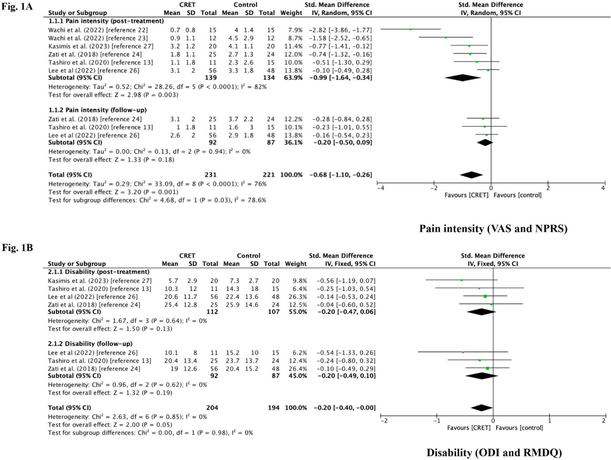 (1A) Forest plot for pain intensity at the end of treatment: Comparison of CRET versus control (exercise, sham CRET, therapeutic ultrasound, manual therapy, or superficial heating therapy) after treatment (Fig. 1.1.1); CRET versus control (exercise, therapeutic ultrasound, or superficial heating therapy) for the follow-up period (Fig. 1.1.2). (1B) Forest plot for disability at the end of treatment: Comparison of CRET versus control (exercise, therapeutic ultrasound, manual therapy, or superficial heating therapy after treatment) (Fig. 2.1.1); CRET versus control (exercise, therapeutic ultrasound, or superficial heating therapy) for the follow-up period (Fig. 2.1.2)