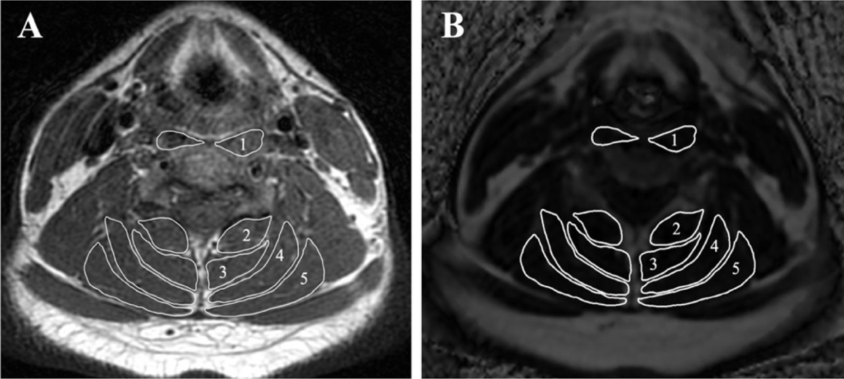 Evaluation of muscle fat infiltration at C4/5. (A) T1-weighting image, (B) fat fraction image using the threshold technique with the Miele lxiv. The following measured muscles were included: 1 – longus colli and capitis, 2 – multifidus, 3 – semispinalis cervicis,4 – semispinalis capitis, and 5 – splenius cervicis and capitis