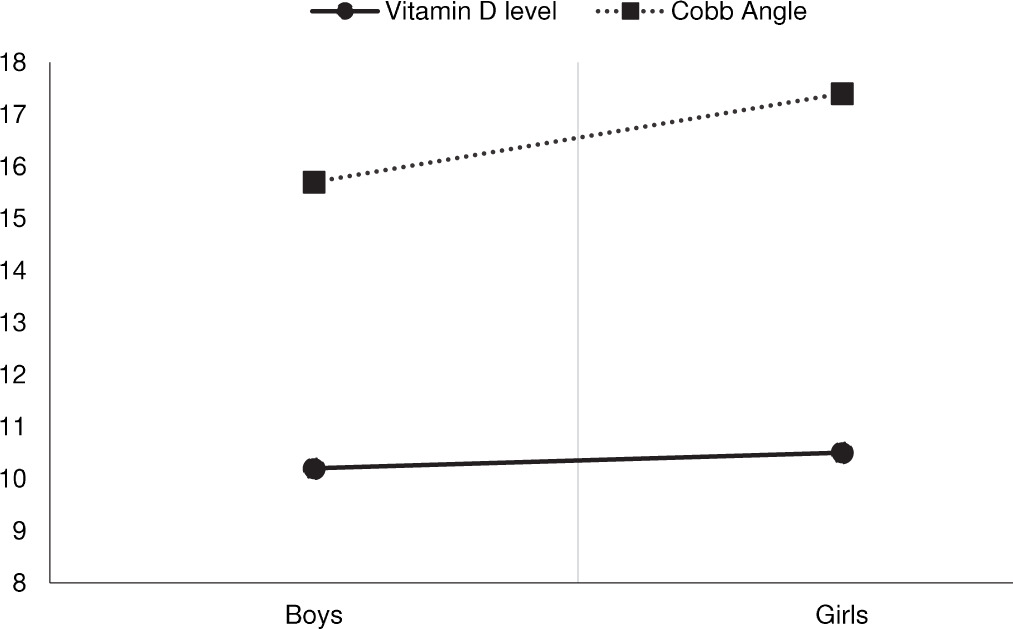 Figure 2 presents the difference in vitamin D levels and Cobb angle between boys and girls. There was no substantial difference in vitamin D level (p = 0.77) or Cobb angle (p = 0.10) between boys and girls.