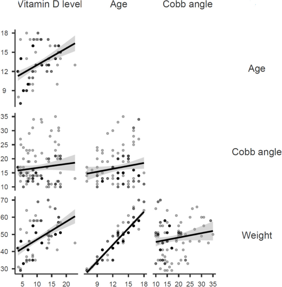 Table 4 presents the correlations between vitamin D level, age, Cobb angle, and weight. Vitamin D was positively correlated with age (r = 0.45, p < 0.001) and weight (r = 0.51, p < 0.001). However, only a weak positive correlation was found between vitamin D level and Cobb angle (r = 0.11, p = 0.18). Figure 3 provides a graphical representation of the correlation between vitamin D level, age, Cobb angle, and weight.
