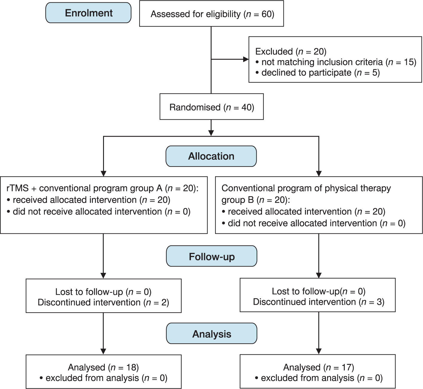 Identical vestibular physical therapy activities were administered to the patients in both groups; however, only those in the study group received rTMS. The interventions consisted of three sessions each week for a total of four weeks.
