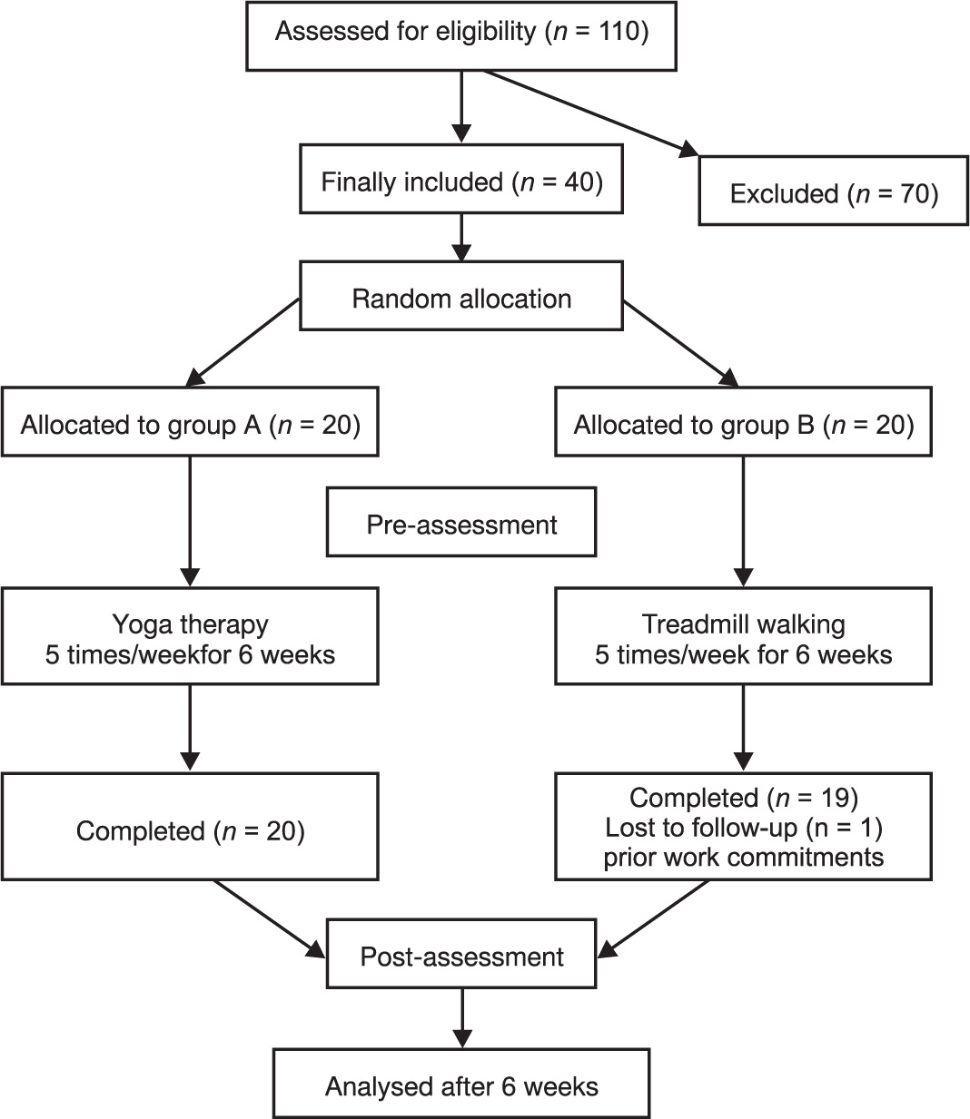 The subjects were sorted using a computer-generated random allocation algorithm into two groups: group A (yoga therapy, n = 20) and group B (treadmill walking, n = 20) (Figure 1).