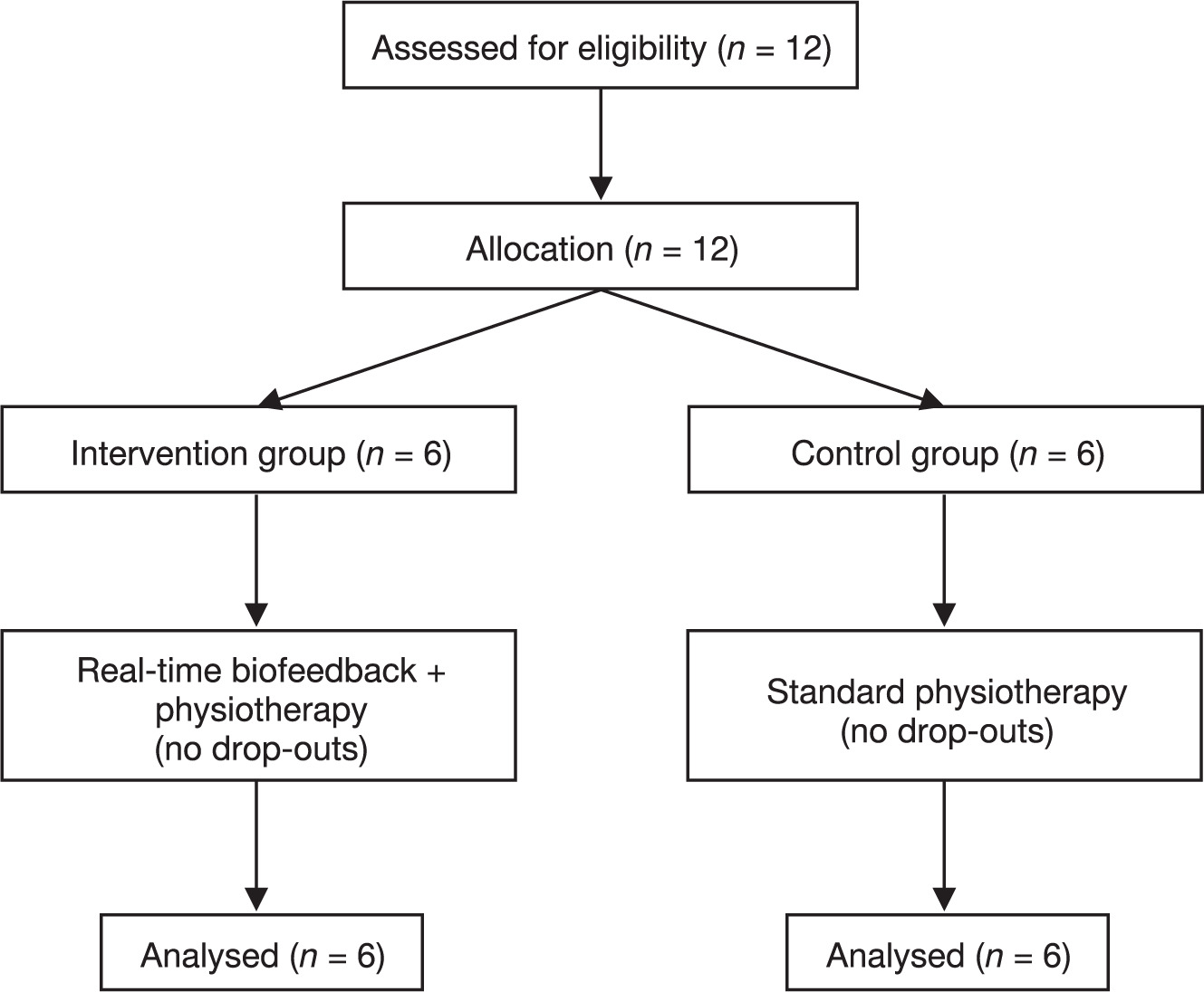 This study was a pilot controlled trial designed to evaluate the effectiveness of a real-time biofeedback device in reducing quadriceps lag in post-ACLR patients. The study was conducted in a clinical setting with participants assigned to either the experimental group (receiving real-time biofeedback along with a standard physiotherapy program) or to the control group (undergoing standard rehabilitation). The flow of participants through the study, including allocation to intervention and control groups, assessments conducted before and after treatment, and analysis, is illustrated in Figure 1.