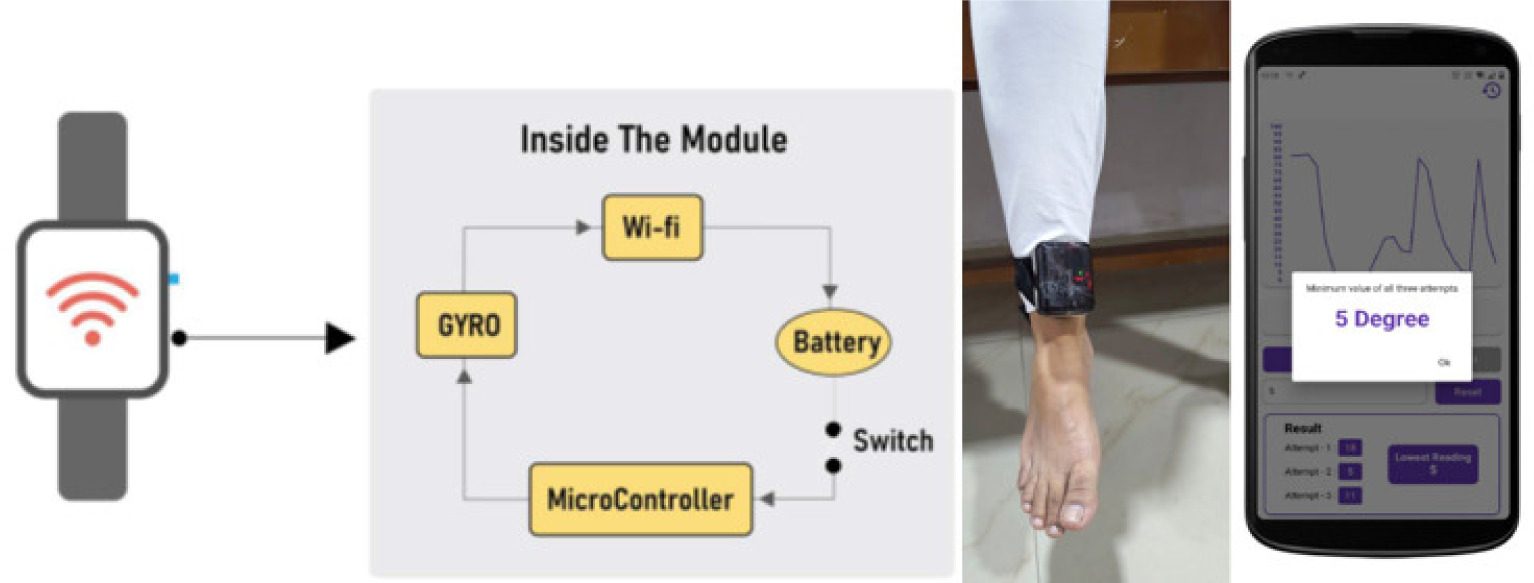 The hardware integrates a 3-Axis Gyro/Accelerometer Microprocessor Unit (MPU 6050) for precise quadriceps lag measurement, a Node microcontroller unit (NodeMCU ESP 8266) with Wi-Fi for communication, a lithium-ion battery for portability, and a Battery Management System (BMS) for safety (Figure 1).