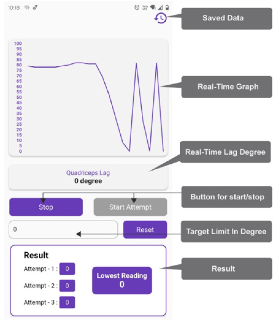 Data recording and storage were managed efficiently within the application. Patient identity number and quadriceps lag data were saved and organised by date for easy reference. The application also generated downloadable PDF reports, which could be used for further analysis and study, providing a comprehensive record of the rehabilitation progress.