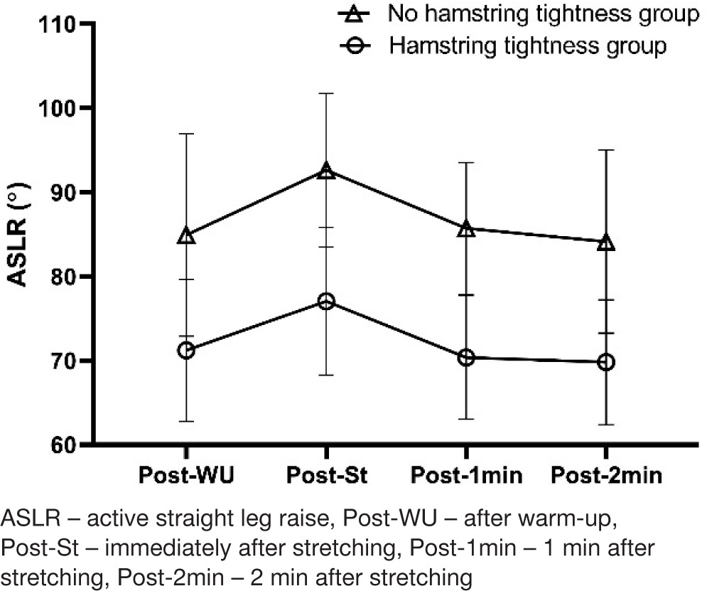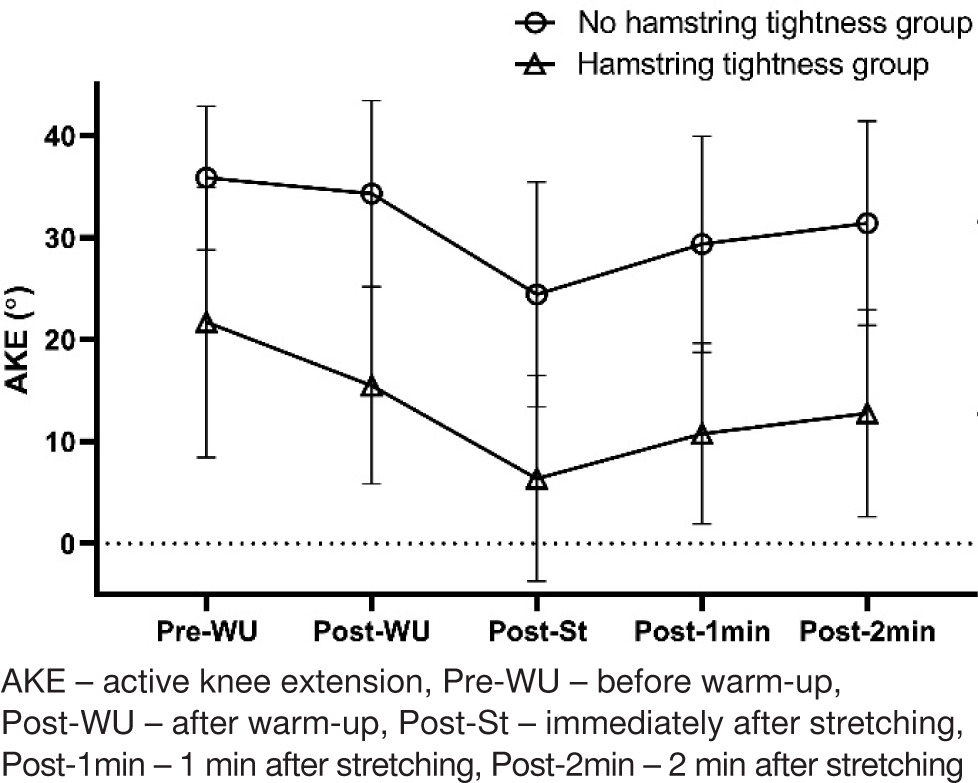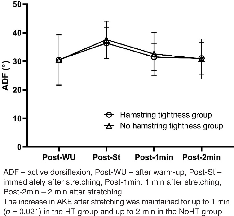 There were significant differences in AKE pre-WU (p = 0.001), post-WU (p < 0.001), post-St (p < 0.001), post-1 min (p < 0.001), and post-2 min (p < 0.001). There was also a significant difference in ASLR post-WU (p = 0.001), post-St (p < 0.001), post-1 min (p < 0.001), and post-2min (p < 0.001). However, there was no significant difference in ADF post-WU (p = 0.976), post-St (p = 0.579), post-1 min (p = 0.635), and post-2 min (p = 0.923). In ROM normalised to post-WU, there were no significant intergroup differences in AKE, ASLR, or ADF at post-St, post-1 min, and post-2 min.