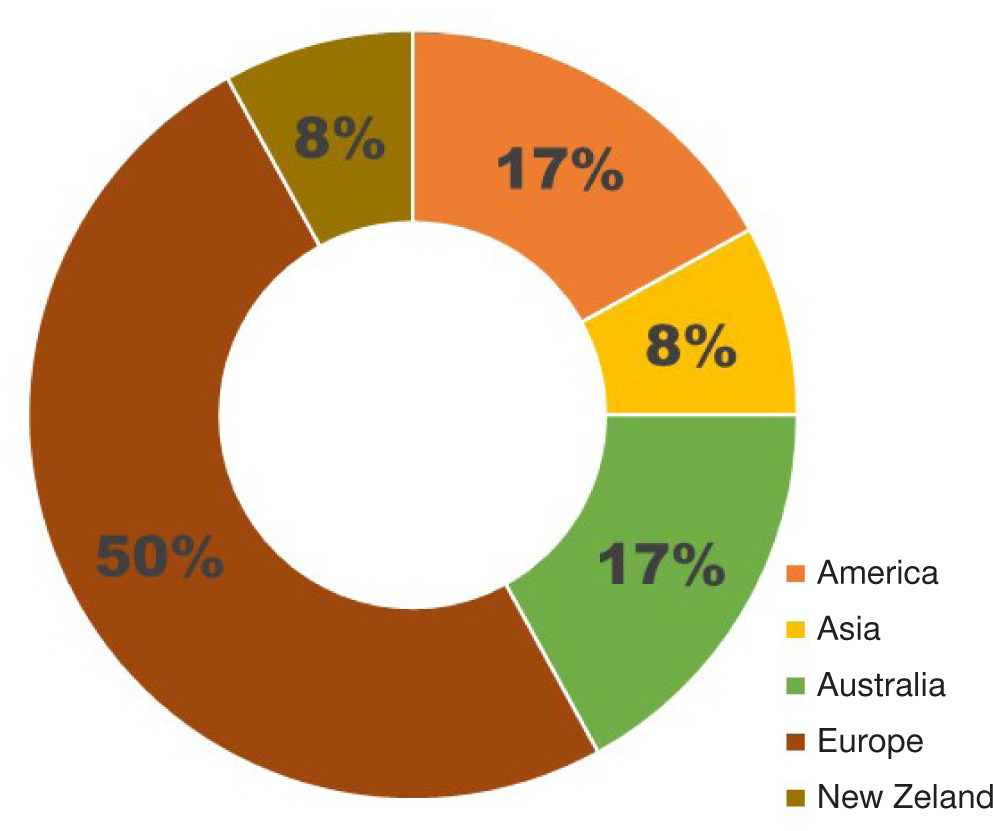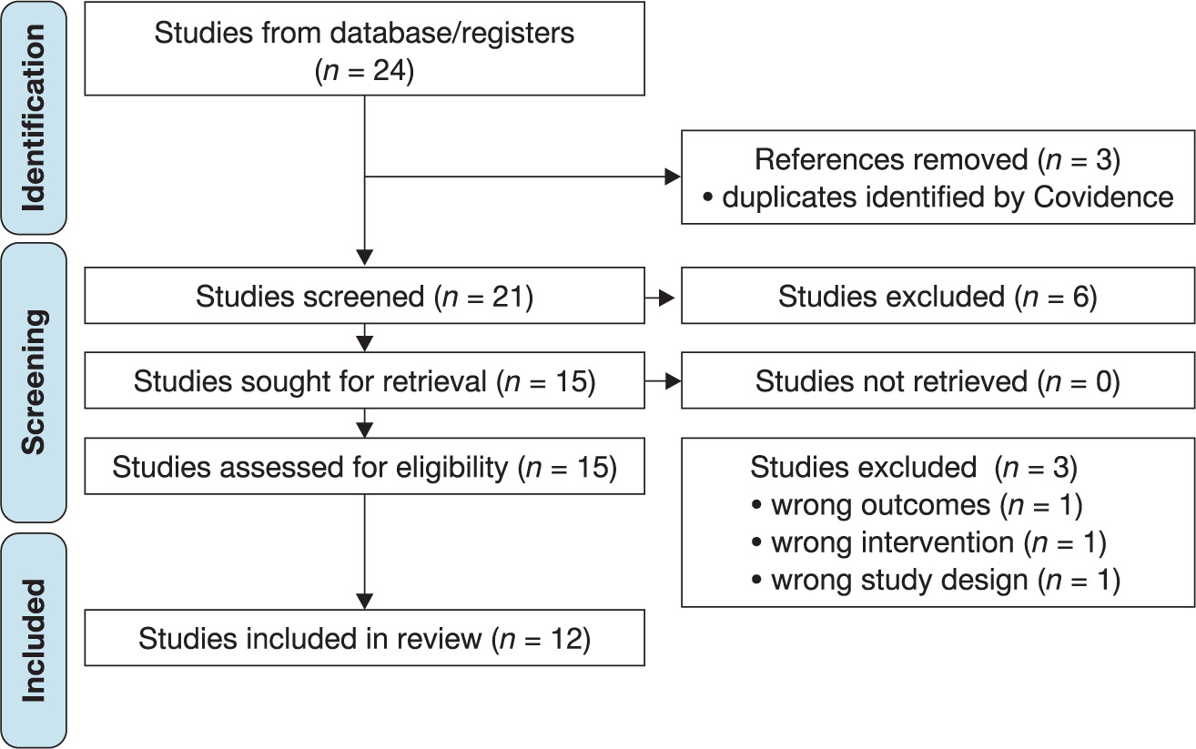 Out of the 21 studies identified, 12 studies were included for data extraction after title, abstract and full-text screening, based on the eligibility criteria. Most of the included studies are from Europe, with four studies conducted in the United Kingdom, two in other European countries, and two in Australia. The Americas reported two studies, while Asia and New Zealand reported one study each (Figure 2).