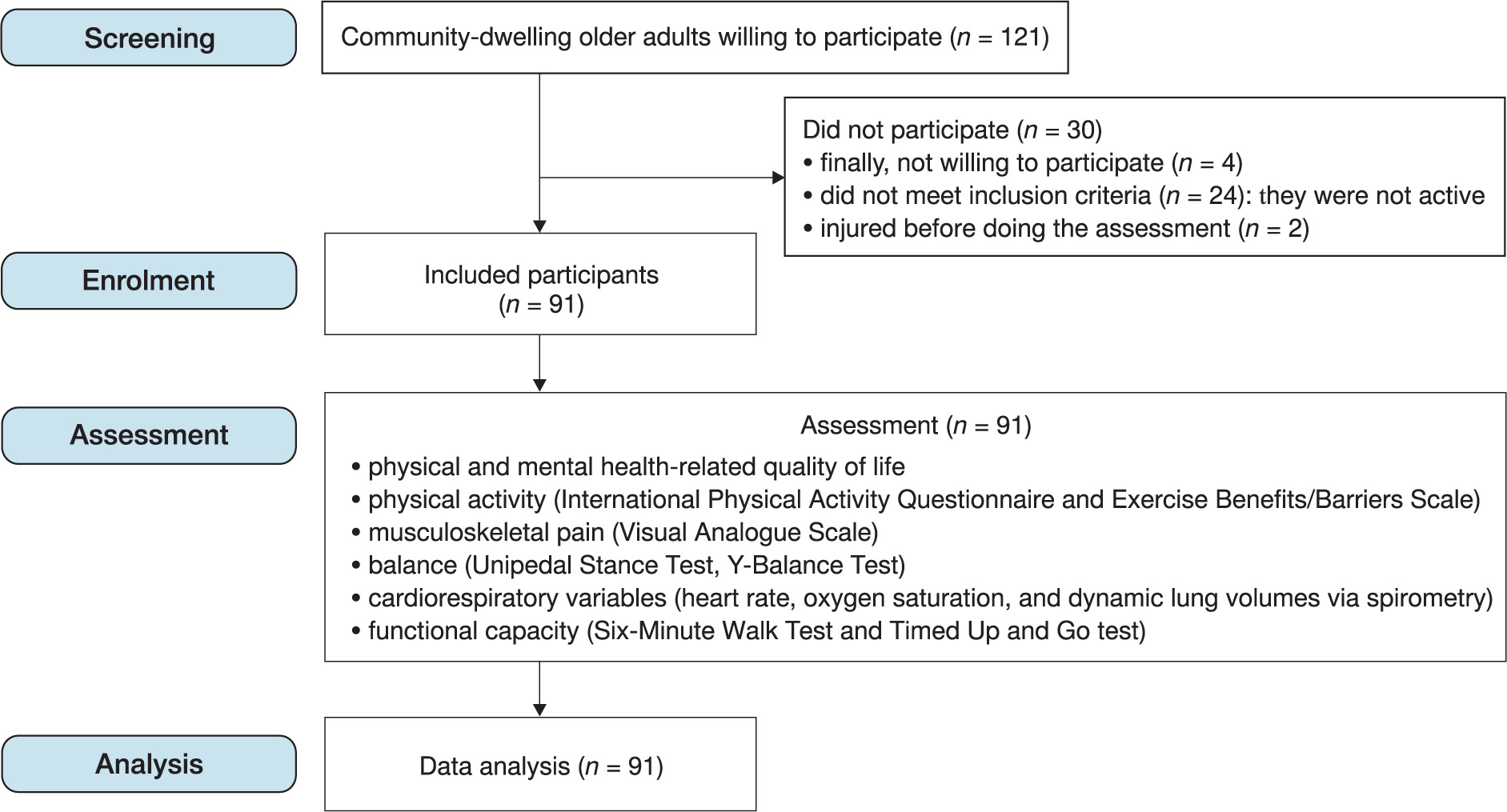 Of the 121 initial participants, in the end, a total of 91 older adults met the inclusion criteria and were analysed. Thirty participants were excluded for not being willing to participate, not meeting the inclusion criteria or being injured prior to assessment. No adverse events were reported (Figure 1).