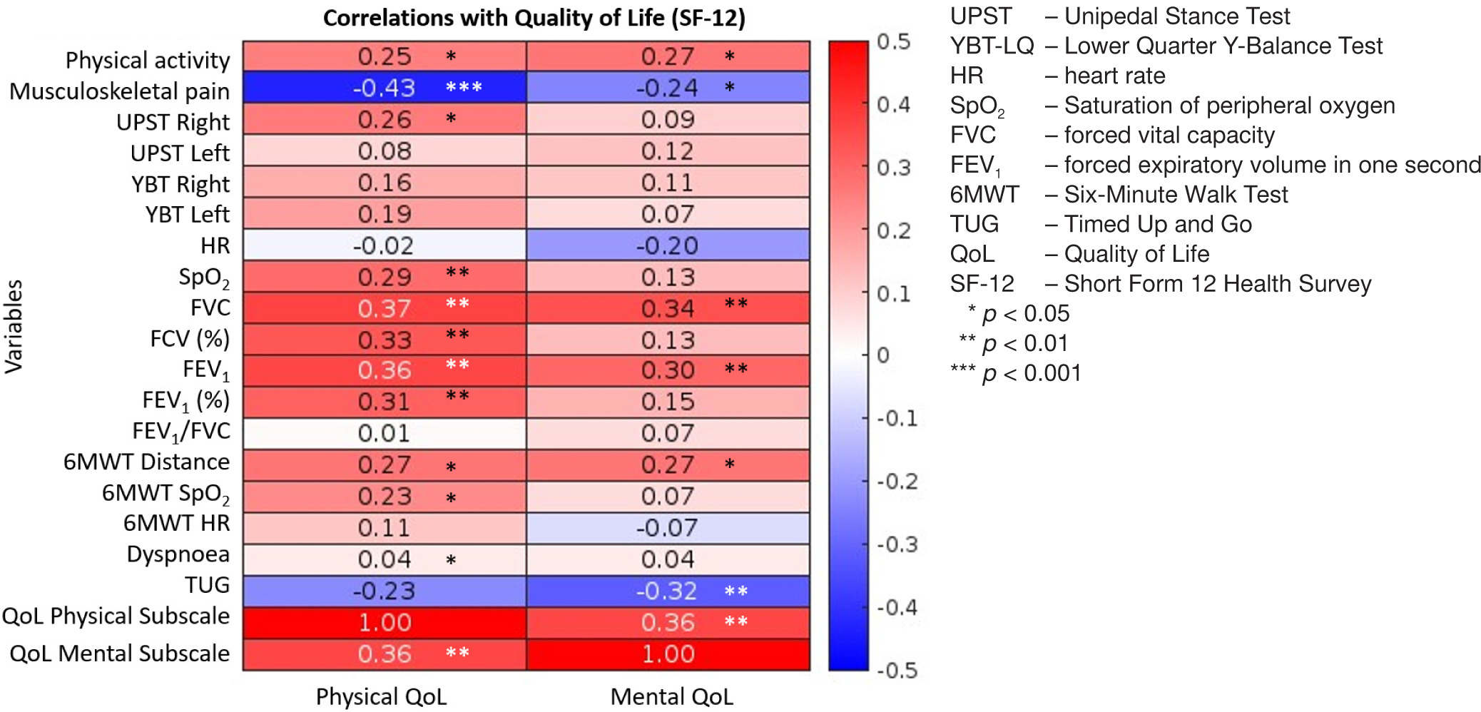 The Pearson Correlation Coefficient showed a statistically positive correlation between both physical and mental health-related QoL and higher levels of physical activity (r = 0.25, p < 0.05; and r = 0.27, p < 0.05, respectively) (Figure 2, and Supplementary material 2). Moreover, both physical and mental health-related QoL showed a statistically negative correlation with pain; so, the higher the pain, the lower the QoL. Physical health-related QoL showed a positive association with cardiorespiratory variables (SpO2, FVC, and FEV1) static balance (UPST), functional parameters (6MWT distance and SpO2 at the end of the test, and the TUG), and the mental health-related QoL. As for mental health-related QoL, it showed positive correlations with respiratory variables (FVC, and FEV1), functional parameters (6MWT distance and the TUG), and physical health-related QoL.