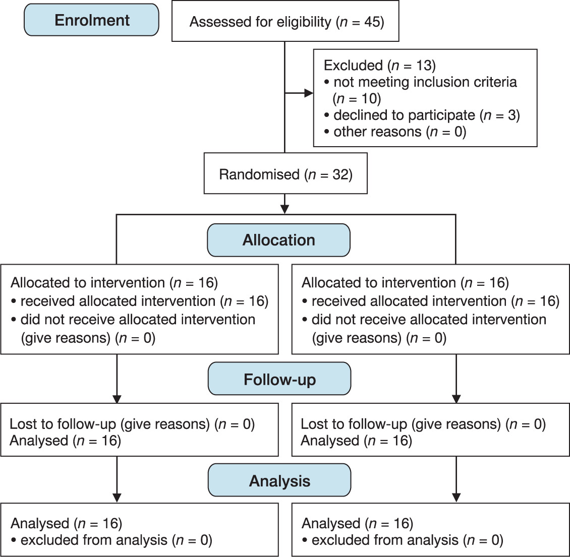 Participants were briefed on the study’s purpose and procedures before it began. Out of 45 individuals with NSLBP screened for eligibility, 32 met the pre-established criteria. The participants were randomly allocated to either the experimental or control group using a lottery method with a 1:1 ratio. The investigator responsible for delivering the intervention also handled the enrolment and allocation of participants. To enhance the reporting quality of the trial, the consolidated standard of reporting trials (CONSORT 2010) guidelines were followed, along with the Template for intervention description and replication (TiDier) checklist that aimed at assessing the quality of the intervention (Figure 1).