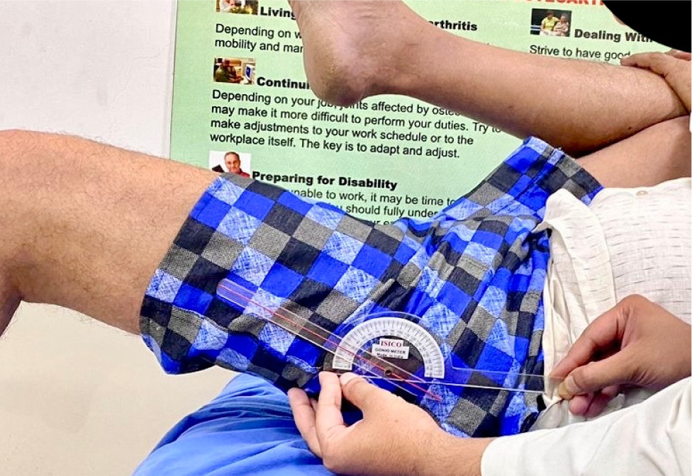 Modified Thomas test to check the length of the iliopsoas muscle: The participant flexed and pulled the non-test limb towards their chest while sitting on the edge of the table or couch with the lower limb that would be tested off the surface. The hip flexion range was assessed using a universal goniometer, with the movable arm aligned with the lateral aspect of the femur, the stationary arm parallel to the couch, and the fulcrum on the greater trochanter. Pre- and post-intervention bilateral measurements were taken, and the results were reported in degrees [3]. The ICC value for the goniometric measurement of the modified Thomas test was 0.92, suggesting high reliability [26] (Figure 4).