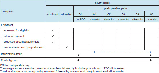 The participants will be followed up four times after surgery, including weeks six (A2), 12 (A3), 18 (A4) and 24 (A5) (Figure 1). The protocols for patient assessment, group allocation, and treatment programme are outlined in Tables 2 and 3.