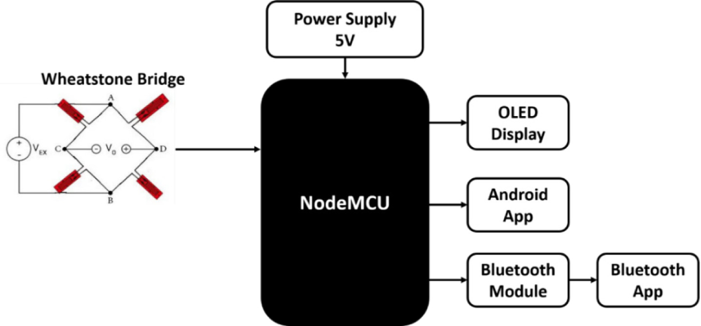 The suggested framework, as shown in Figure 1, accepts input from FlexiForce A301-100 force sensors. The sensor provides an analogue value. The NodeMCU has only one analogue PIN, which is why a Wheatstone bridge circuit was used to select input from each sensor. The sensor value is measured in terms of the load received by the sensor. Estimated values are displayed on the OLED display. A Blue-tooth app was designed to display readings on an Android phone. To send sensor data to the mobile app, a HC05 Blue-tooth module is connected to the NodeMCU board. The user then connects the device to the smartphone via the HC05.